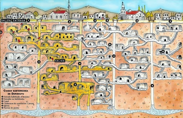 Nei livelli sotterranei sono stati trovati sale da pranzo, cucine annerite dalla fuliggine, cantine, botteghe di alimentari, una scuola, numerose saloni e anche un bar.La città ha beneficiato della presenza di un fiume sotterraneo e pozzi d’acqua. Era una piccola città completamente autosufficiente, che ancora oggi stupisce studiosi e ingegneri.La costruzione di una città come Derinkuyu sarebbe stata un’impresa per chiunque, anche in tempi moderni e con attrezzature moderne. Pensare che un’opera del genere sia stata realizzata in un’epoca così remota è semplicemte stupefacente, paragonabile solo alle piramidi d’Egitto. Ma chi ha costruito questa enorme città sotterranea?